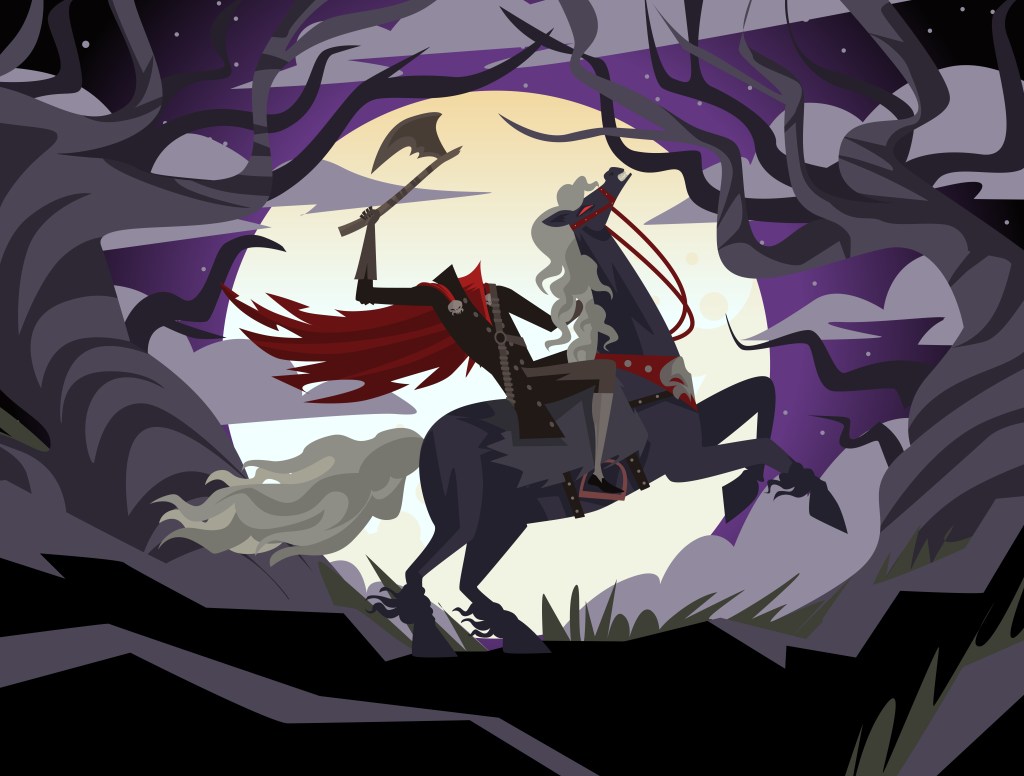 Dullahan is a headless horseman and possibly the inspiration for Sleepy Hallow. He rides a horse or drives the death coach to collect souls of the dead. His whip is made from a human spine and he carries his decomposing head in his arm. If you stumble upon him while collecting souls, he will run you down and take your soul too. Once he speaks your name, you are marked and there is nothing you can do.